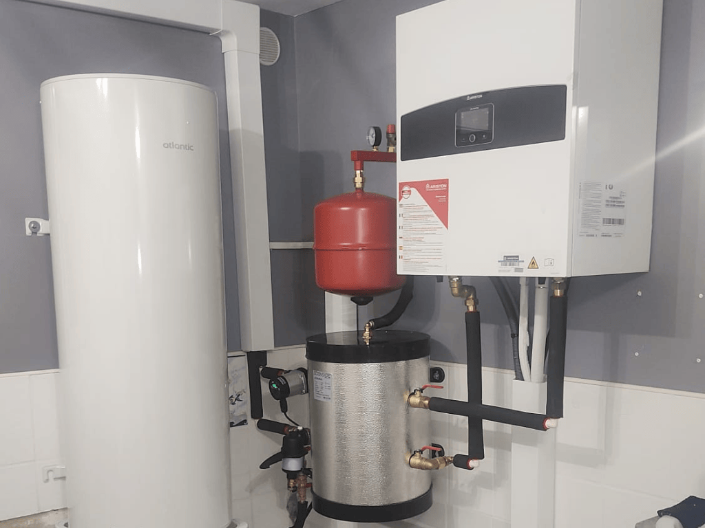 Dans cette configuration, le chauffage du logement est pris en charge par une pompe à chaleur air/eau, qui alimente les radiateurs ou le plancher chauffant. L’eau chaude sanitaire est produite à part, via un ballon thermodynamique qui capte les calories de l’air pour chauffer l’eau. Les deux appareils fonctionnent indépendamment, mais se complètent au quotidien, avec un usage stable et une continuité de service.